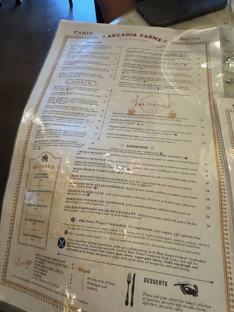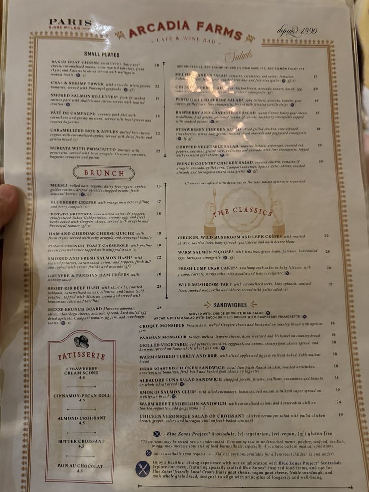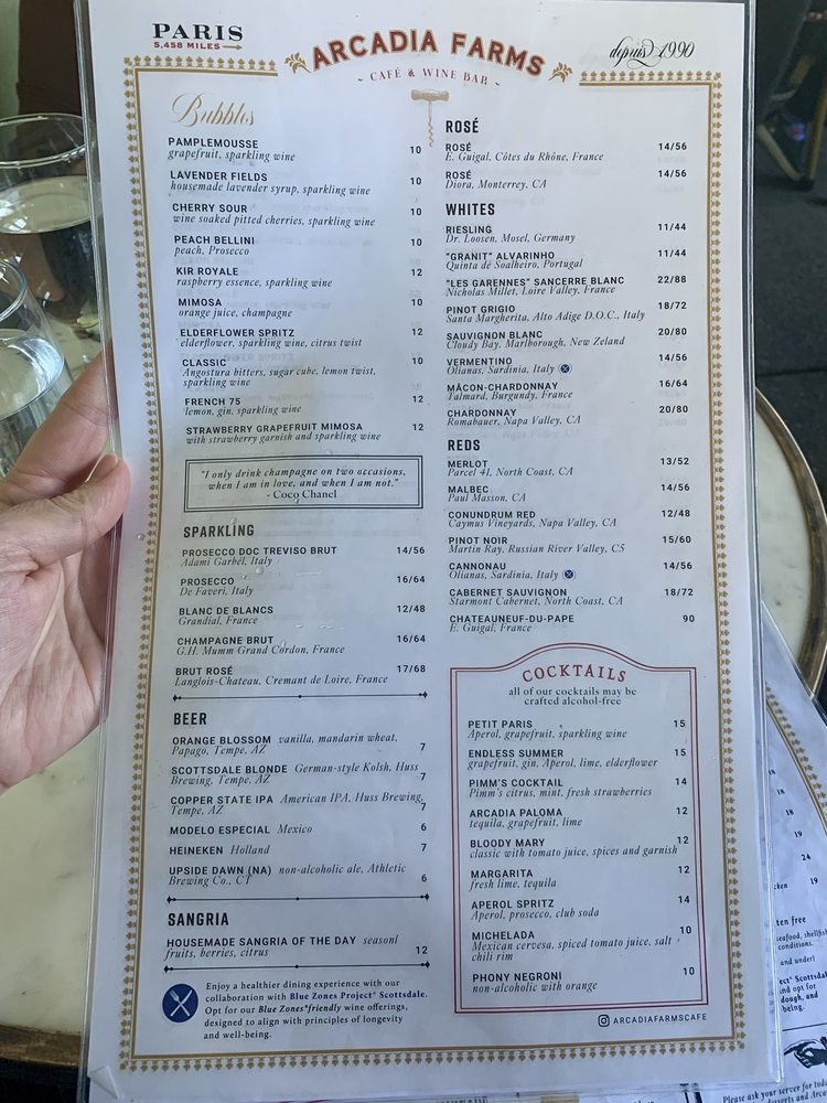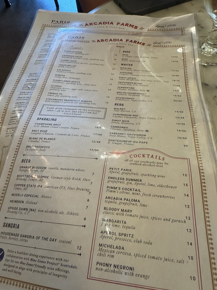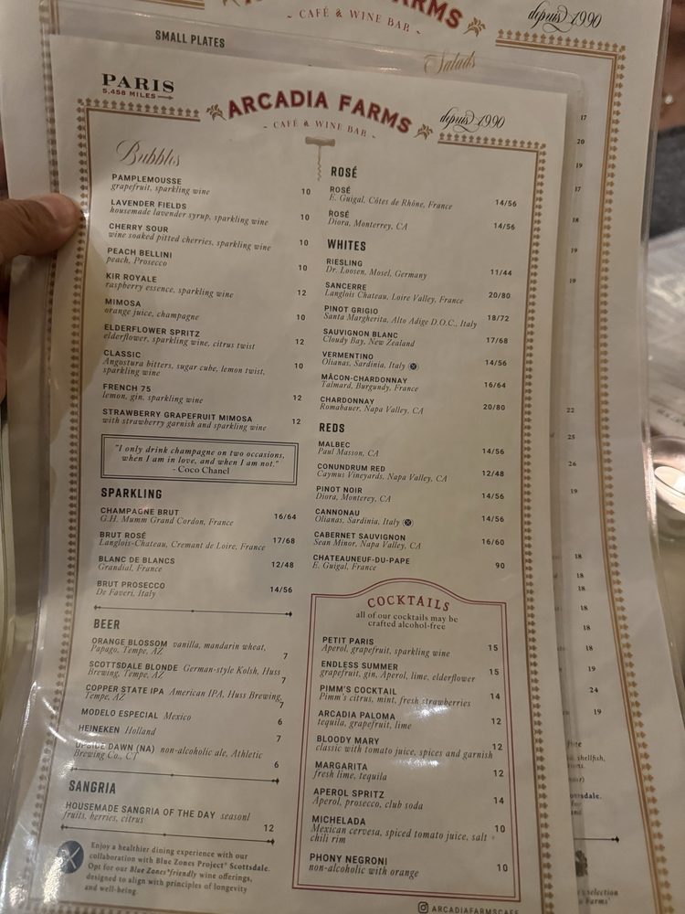 Arcadia Farms Cafe, located in Scottsdale, AZ, offers a charming dining experience with its French decor and spacious indoor and outdoor seating. The menu features a variety of tapas and small plates, including vegan and vegetarian options. Customers praise the quick service and delicious food, such as the Peach French Toast Casserole and Salmon Hash. The cafe is known for its Bubbles Cocktails, A La Carte options, and healthy Quick Start dishes like the Signature Granola Parfait. The establishment is women-owned and has garnered high ratings for its Blue Zone-approved menu items. With a full bar, outdoor seating, and a cozy ambiance, Arcadia Farms Cafe is a must-visit for brunch, lunch, or happy hour. Don't miss out on their specialty dishes and welcoming atmosphere.